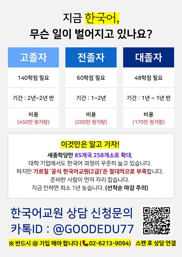 "전 세계 한국어 수요 폭발 → 한국어교원 2급 준비생 모집 (선착순)”