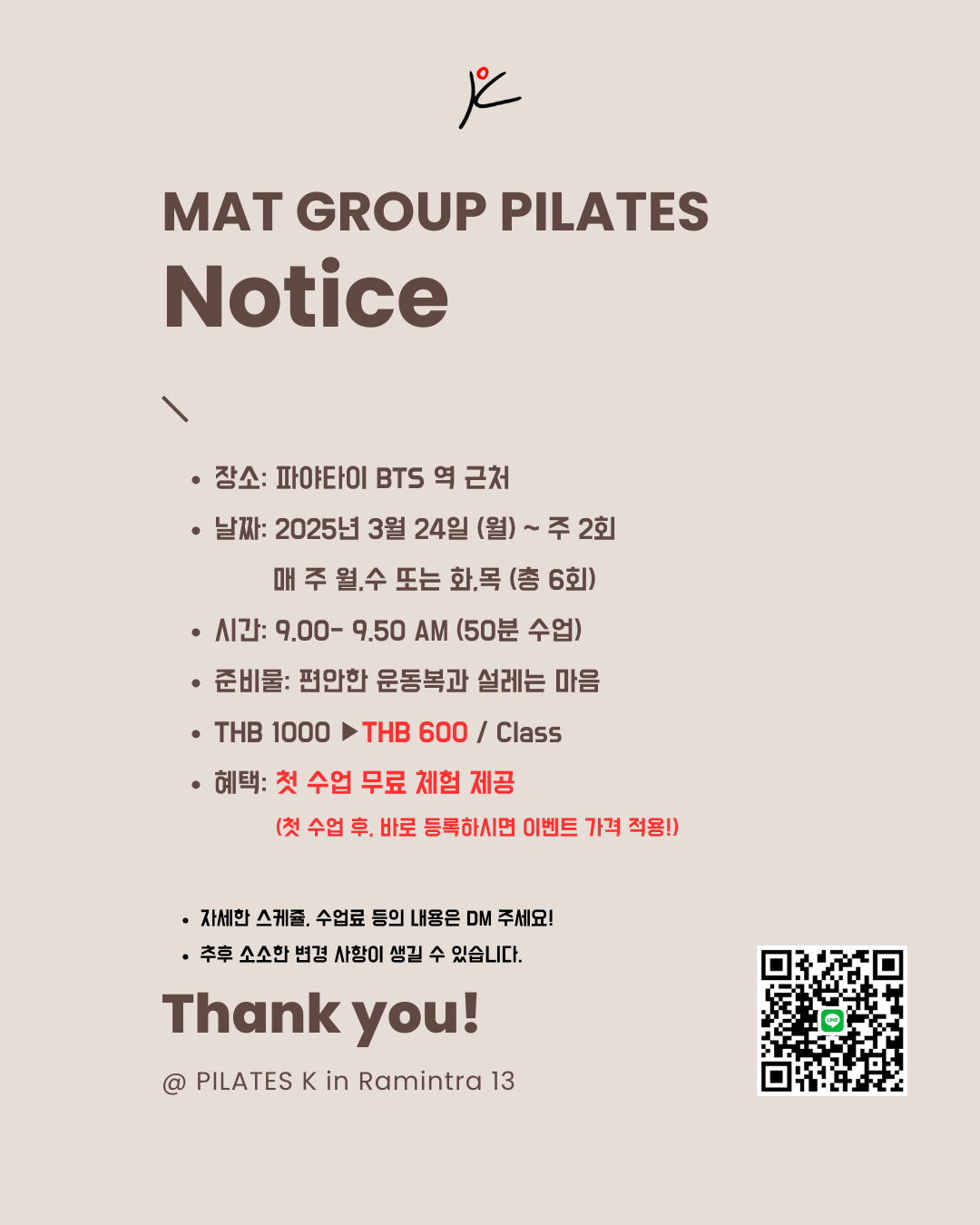 안녕하세요. 방콕에서 매트 필라테스 그룹 수업을 진행합니다.