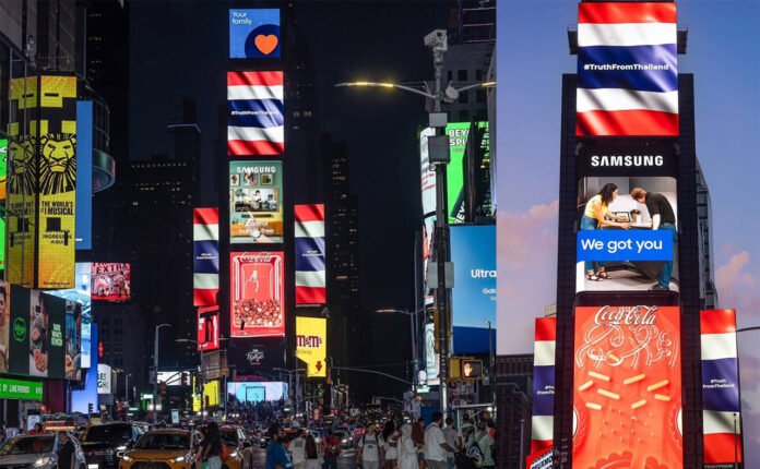 세계에서 가장 비싼 광고 매체 중 하나인 타임스퀘어 광고판은 태국 민족주의를 국제사회에 알리기 위한